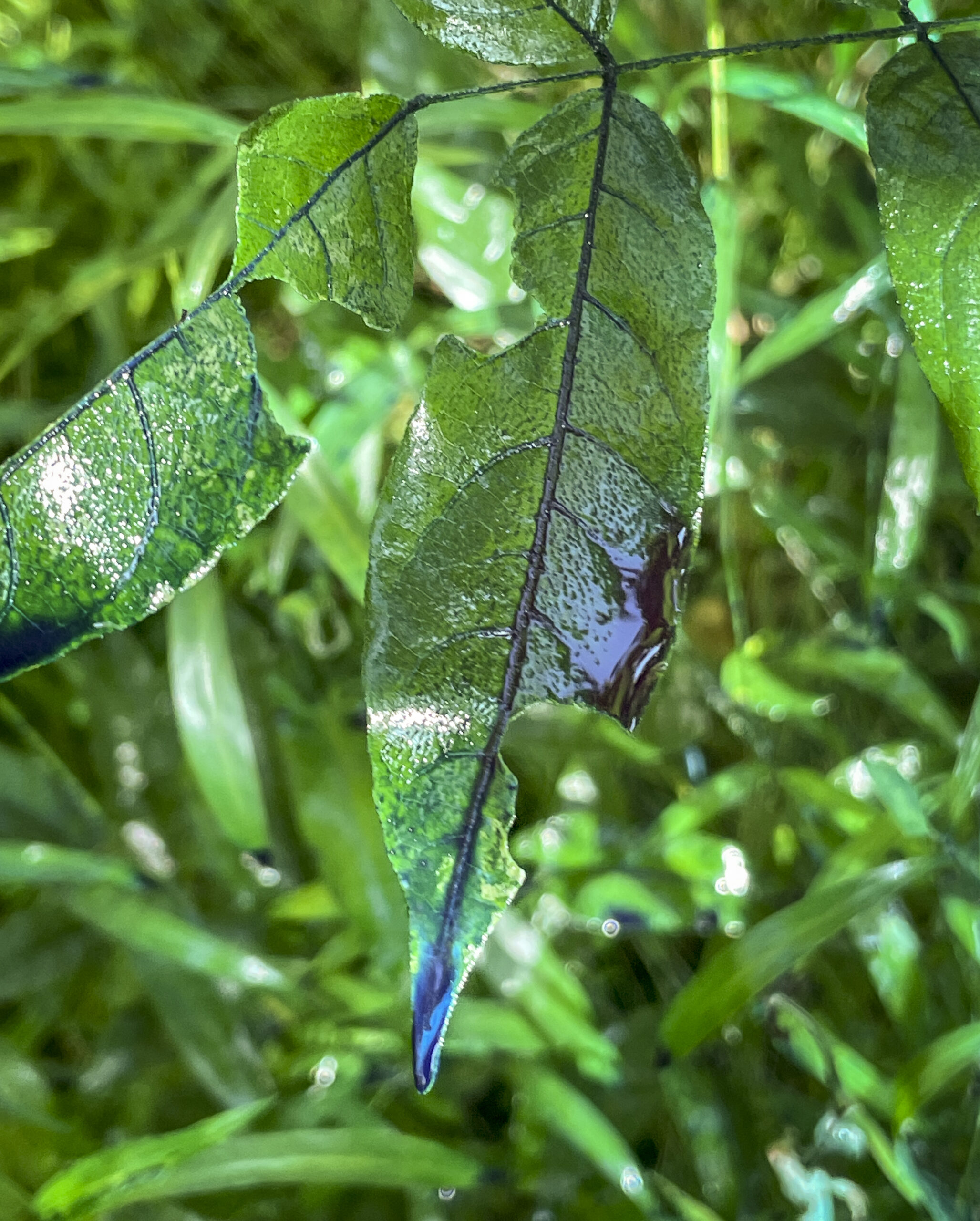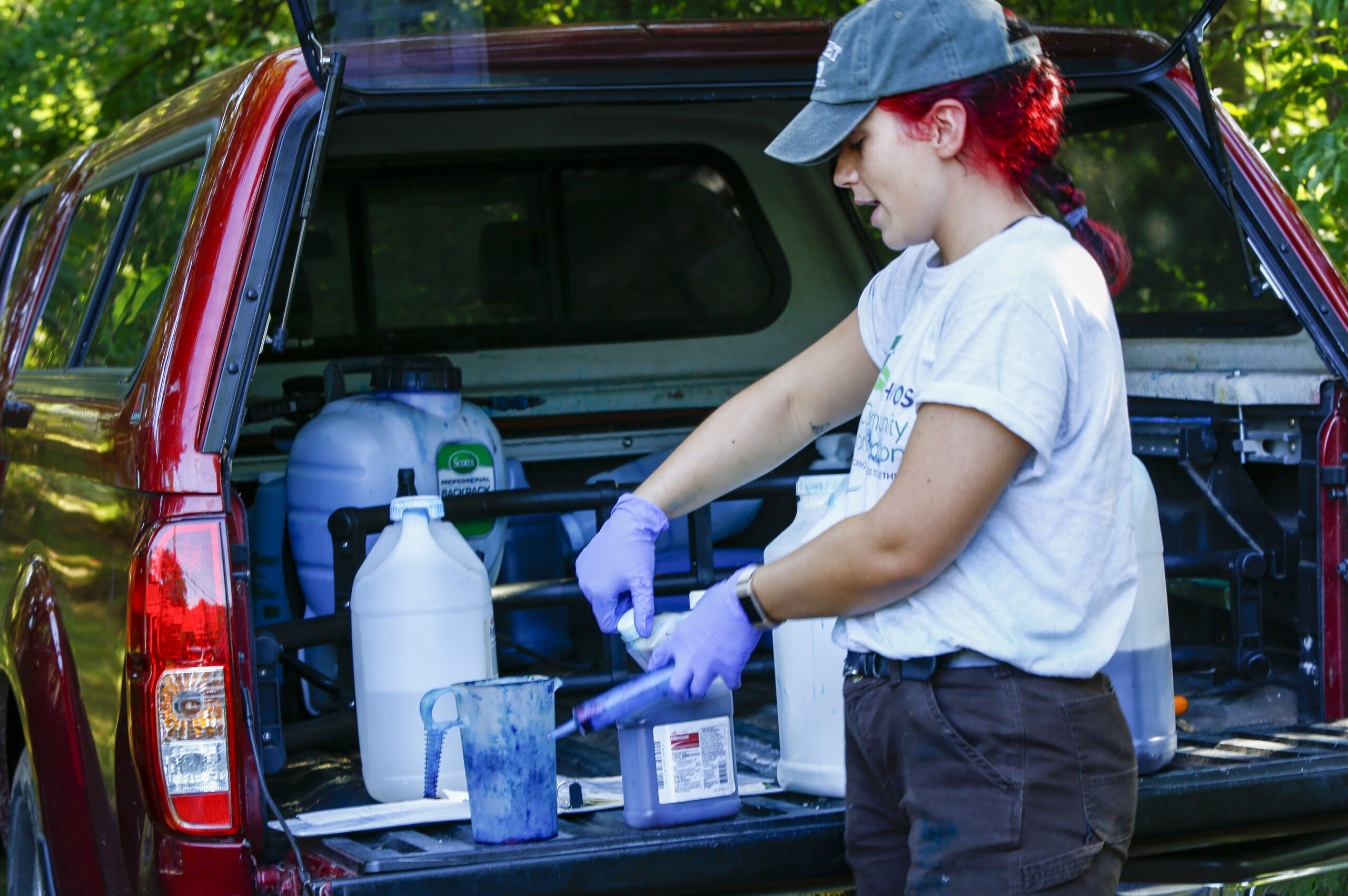 They tromped through chest-high weeds, hunting down the long leaves and woody trunks of the wisteria vine to spray with blue-hued herbicide — dyed so they could see what they sprayed, steward Jenna Delgado explained. Japanese wisteria is considered invasive because it spreads quickly and has heavy vines that can choke other plants and topple small trees. It also has a tough root system that makes it hard to kill.
